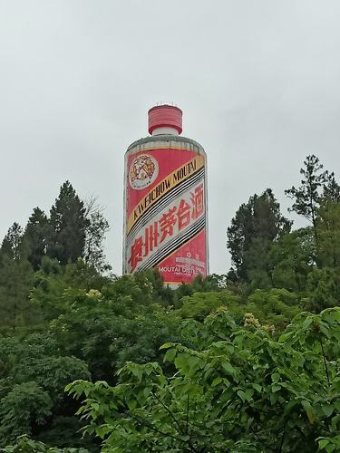 在国酒门东侧山头上耸立着一个巨大茅台瓶——“天下第一瓶”,瓶身高 31.25 米,直径10.2米,体积 1469立方米(据说用来装酒的话,容量可以满足十四亿人都喝到一毫升的酒),被上海大世界吉尼斯总部评为最大的实物广告。